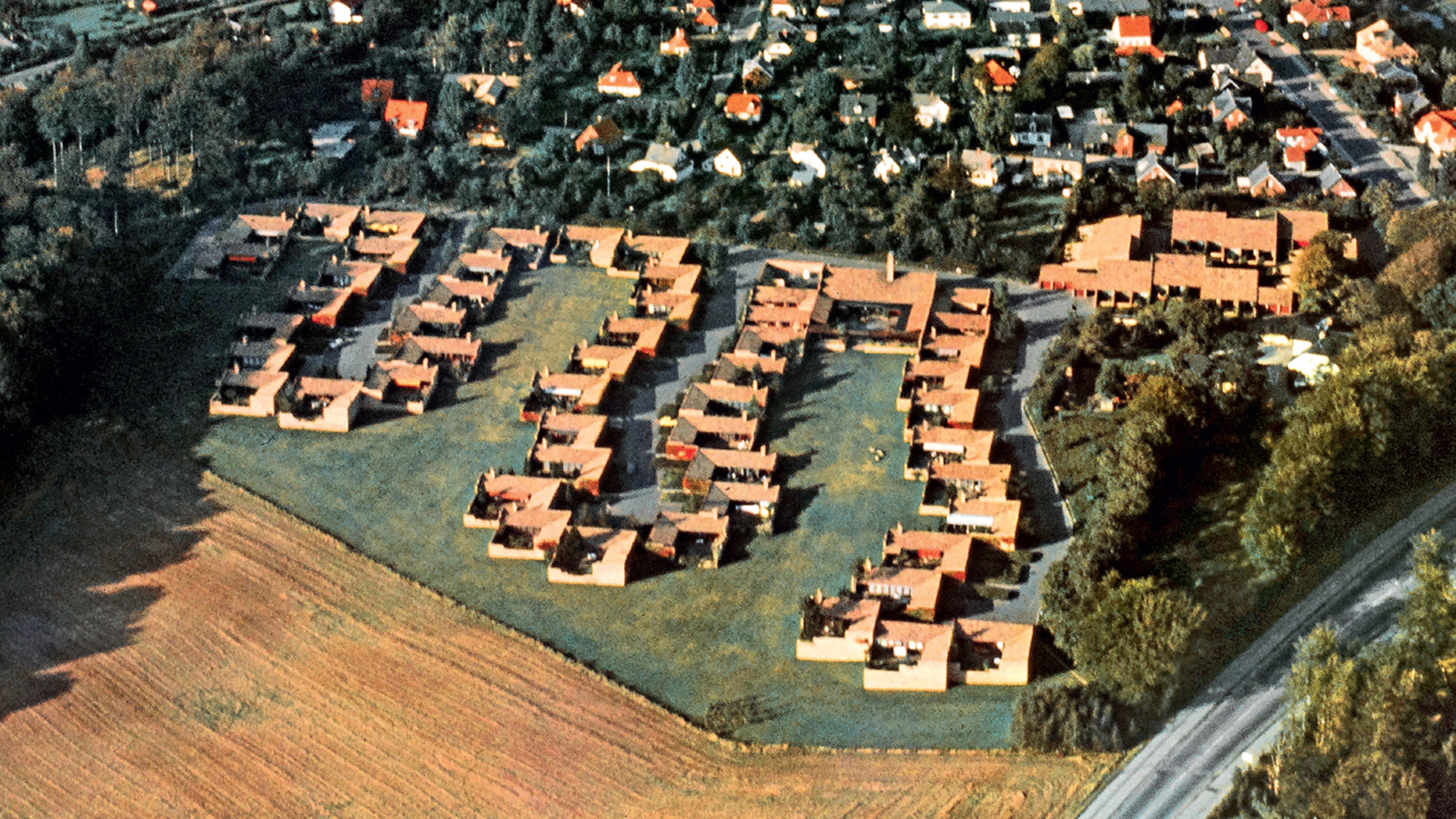 Every couple of years I think again about this project from Jørn Utzon of Sydney Opera House fame, and part of it is because I think the diagram is strong and clear - the project is a series of “fingers” which extend from the town into the countryside, creating an edge and enclosing collective open space.