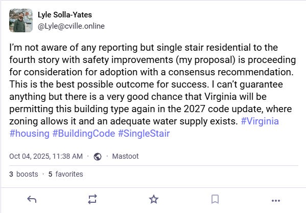 Word from local Planning Commissioner, Lyle Solla-Yates, on a niche microblogging platform was that single-stair multifamily building up to 16 unit would be considered for the 2024 edition of the Virginia Construction Code with a consensus recommendation from the advisory committee.